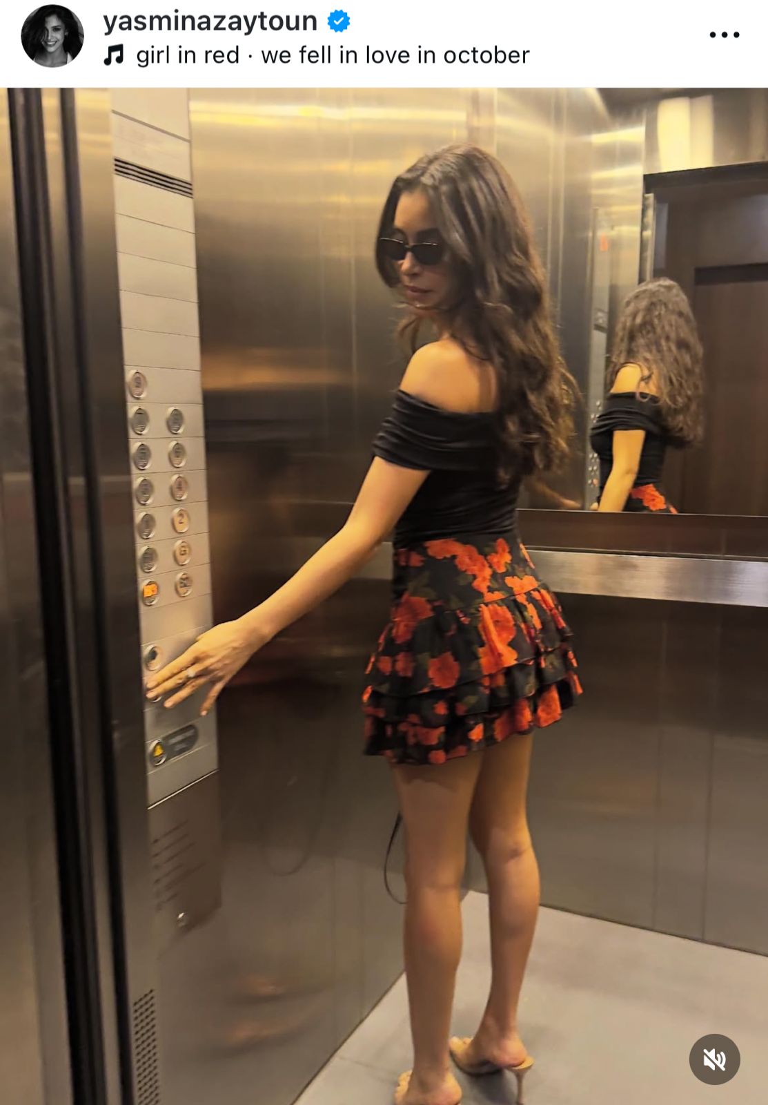 نشرت ملكة جمال لبنان السابقة ياسمينا زيتون صورة جديدة على حسابها الرسمي في إنستغرام، تظهر فيها بإطلالة أنيقة داخل مصعد، مرتدية “بلوزة” سوداء مكشوفة الكتفين وتنورة قصيرة متعددة الطبقات ذات نقوش زهرية باللونين الأحمر والأسود. وأكملت اللوك بنظارات شمسية عصرية، مما أضفى عليها لمسة من الجرأة والأناقة.