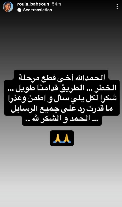 وكتبت رولا قائلة: “الحمدالله أخي قطع مرحلة الخطر.. الطريق قدامنا طويل.. شكرا لكل يلي سأل واطمن وعذرا ما قدرت رد على كل الرسايل.. الحمد والشكر لله”.