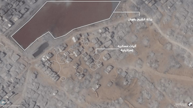 وتبين الصور الملتقطة في 18 أيلول الجاري، تمركز آليات الجيش الإسرائيلي في منطقة حي الكرامة شمال غرب مدينة غزة، مع توغلها أيضا في الشمال الشرقي من المدينة، وتحديدا في منطقة بركة الشيخ رضوان وشارع الجلاء، كما توغلت الآليات في منطقة تل الهوا أمس الثلاثاء قرب منطقة الجامعات جنوب مدينة غزة.