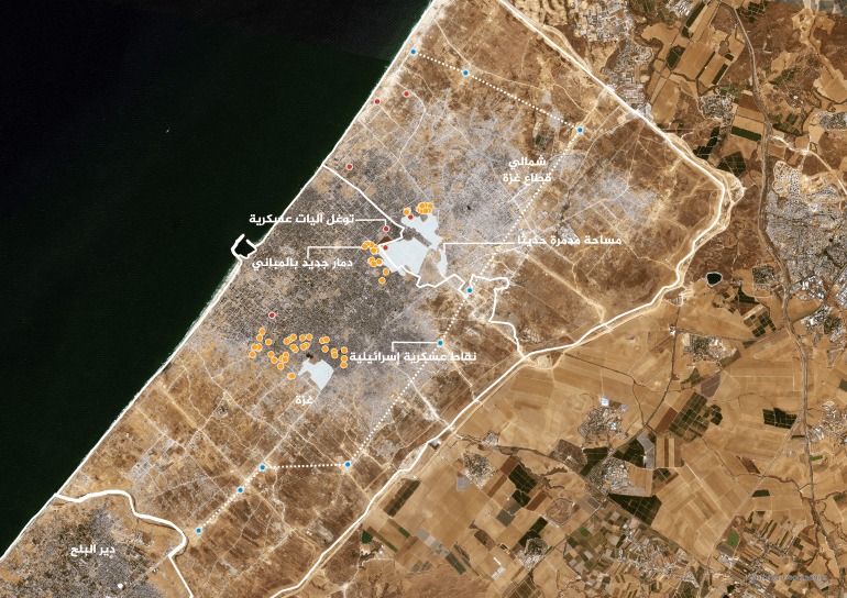وبحسب “الجزيرة”، تبدأ هذه النقاط من منطقة بيت لاهيا شمالا مروراً بمعبر إيرز، ثم شرقي جباليا وصولاً إلى نقطة أخرى جنوبا باتجاه حي الشجاعية، بينما تتوزع 4 نقاط إضافية شرق حي الزيتون ونقاط أخرى بمنطقة نتساريم على طريق صلاح الدين.