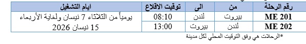 وبالتالي سيصبح جدول رحلات الشركة من لندن وإليها للفترة الممتدة من الثلاثاء 7 نيسان ولغاية الأربعاء 15 نيسان 2026 وفقاً للتالي: