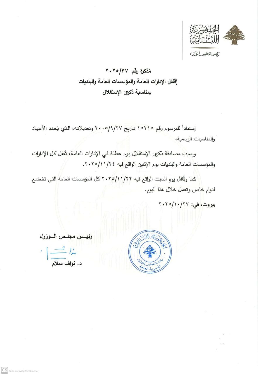 صدر عن رئيس مجلس الوزراء نواف سلام مذكرة تقضي بالإقفال العام لمناسبة ذكرى الاستقلال.