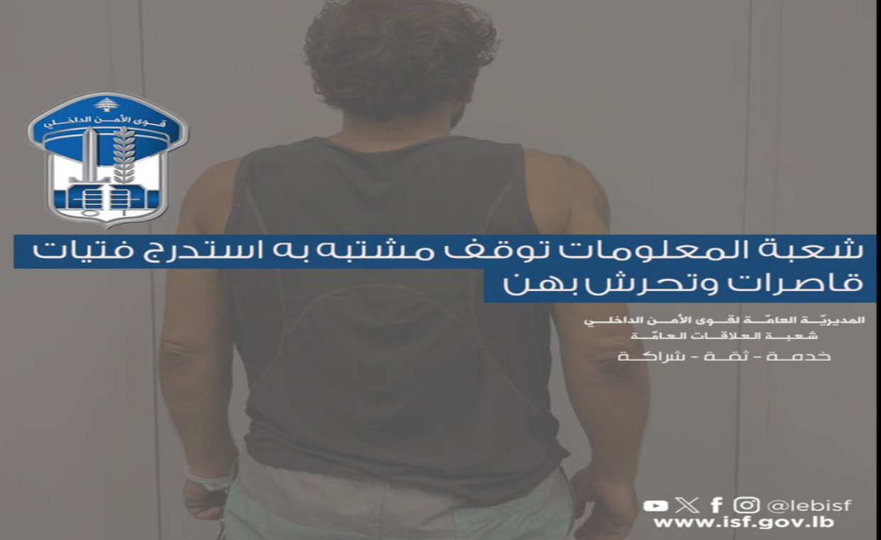 في إطار المتابعة اليومية التي تقوم بها قوى الأمن الداخلي للحد من الجرائم بمختلف أنواعها وتوقيف المتورطين بها، توافرت معطيات لدى شعبة المعلومات حول قيام مجهول باستدراج فتيات قاصرات في محلة كورنيش الرملة البيضاء، وإقدامه على التحرش بهن داخل سيارته أو في منزله.