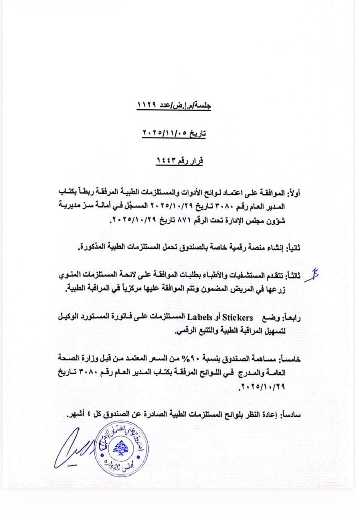 كذلك قرر إنشاء منصة رقمية خاصة بالصندوق تحمل المستلزمات الطبية المذكورة، على أن تتقدم المستشفيات والأطباء بطلبات الموافقة على لائحة المستلزمات المنوي زرعها في المريض المضمون وتتم الموافقة عليها مركزياً في المراقبة الطبية. وقرر ايضا إعادة النظر بلوائح المستلزمات الطبية الصادرة عن الصندوق كل 4 أشهر.