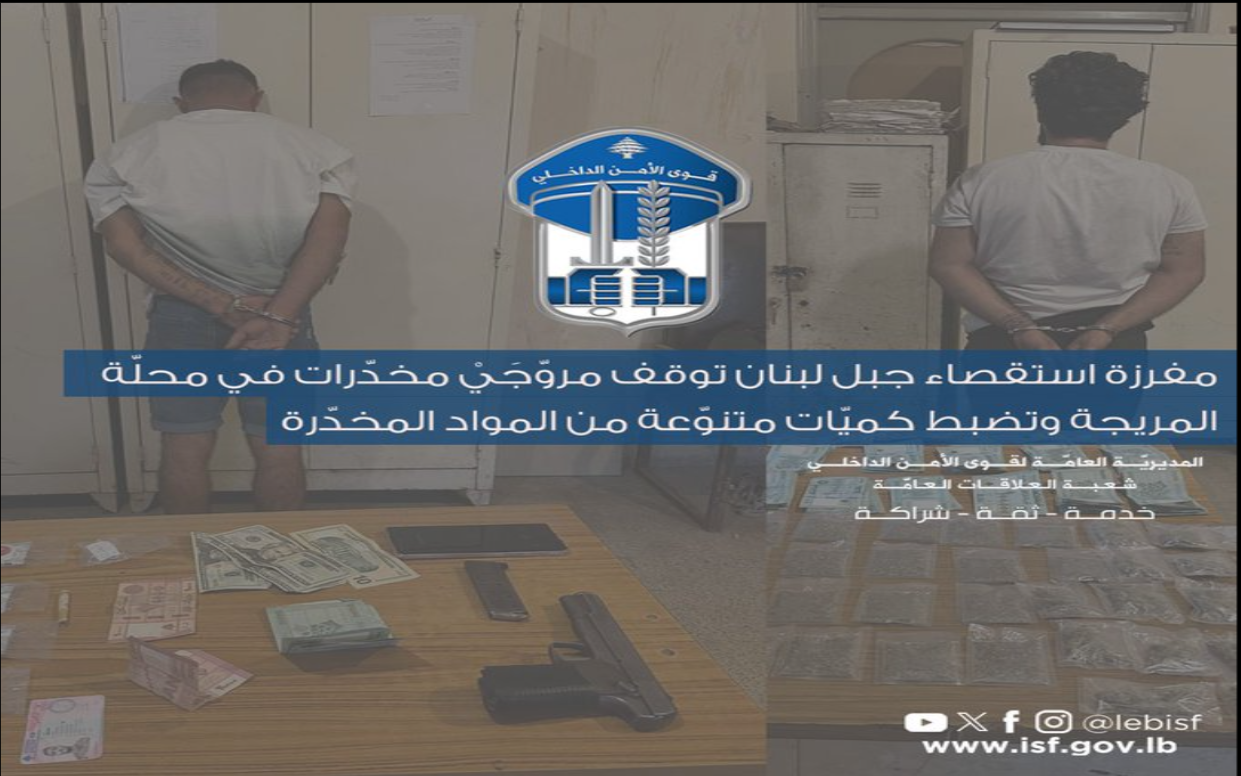 في إطار المتابعة المستمرّة التي تقوم بها قوى الأمن الداخلي لمكافحة كل أنواع الجرائم في مختلف المناطق اللبنانية، وتوقيف مرتكبيها، توافرت معطيات لدى مفرزة استقصاء جبل لبنان في وحدة الدرك الإقليمي حول قيام شخصَيْن على متن درّاجتين آليّتين بترويج المخدّرات في محلّة المريجة.