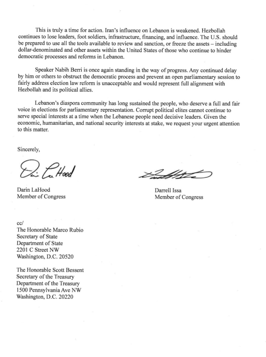 بصفتنا أعضاء في الكونغرس، نُثني على نجاحكم في تحقيق اتفاقيات سلام تاريخية في الشرق الأوسط. ومن أجل الاستمرار في إنجاز هذا العمل الحيوي، يظلّ موقف الولايات المتحدة تجاه لبنان ذا أهمية كبيرة. وعلى الرغم من أن لبنان مرّ بالعديد من التحديات، إلا أن هناك الكثير مما يجب القيام به لضمان استمرار لبنان سياديًا ومستقلًا ومزدهرًا كشريك وحليف قوي.