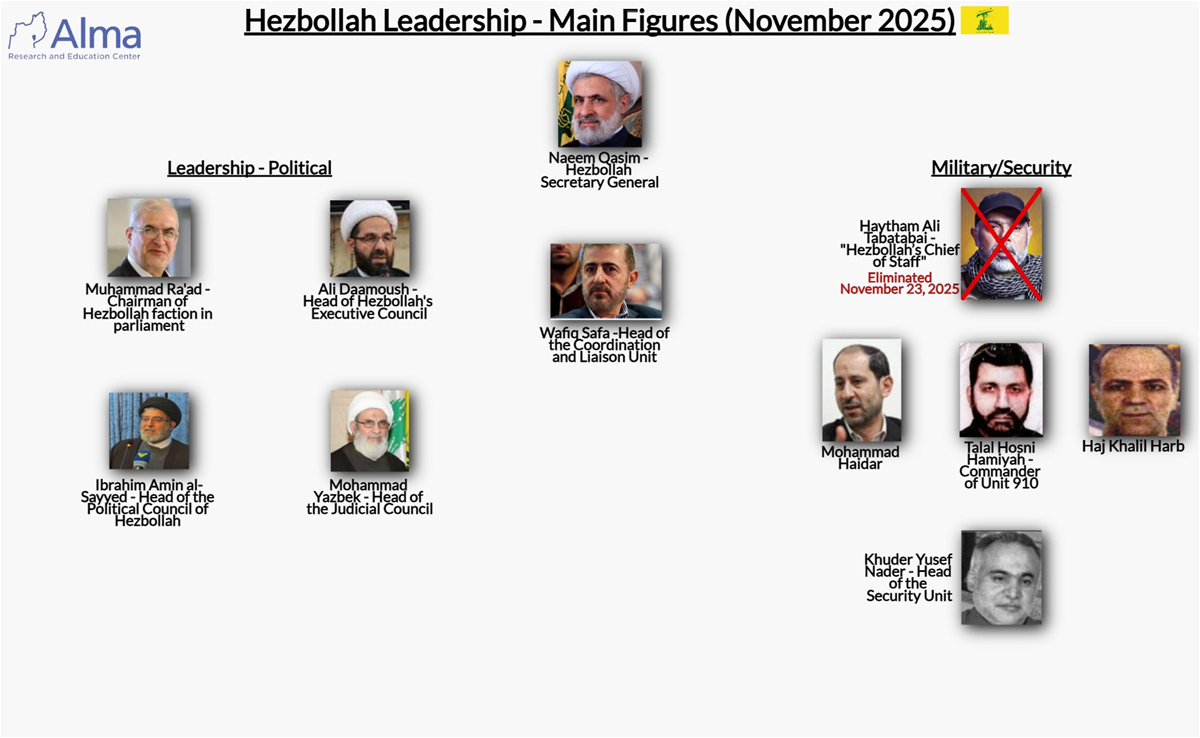 نشر معهد “ألما” الإسرائيلي للدراسات الأمنية، خارطة تظهر صور قادة ومسؤولي “حزب الله” لاسيما على صعيد الجناحين السياسي والعسكري.