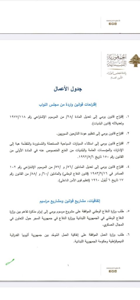 يعقد مجلس لوزراء عند الساعة الثالثة من بعد ظهر يوم الخميس الواقع فيه 27-11-2024 جلسة في السرايا لبحث المواضيع المبينة في جدول الأعمال أدناه.
