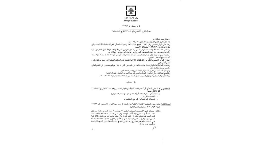 صدر عن مصرف لبنان تعميم بشأن رفع سقف السحوبات الشهرية.