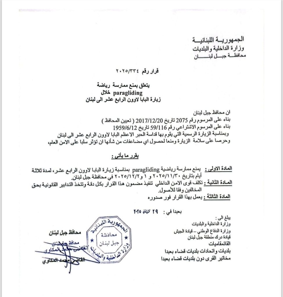 فيما أصدر محافظ جبل لبنان القاضي محمد المكاوي قراراً يتعلّق بمنع ممارسة رياضة الـ paragliding خلال زيارة البابا لاوون الرابع عشر إلى لبنان.