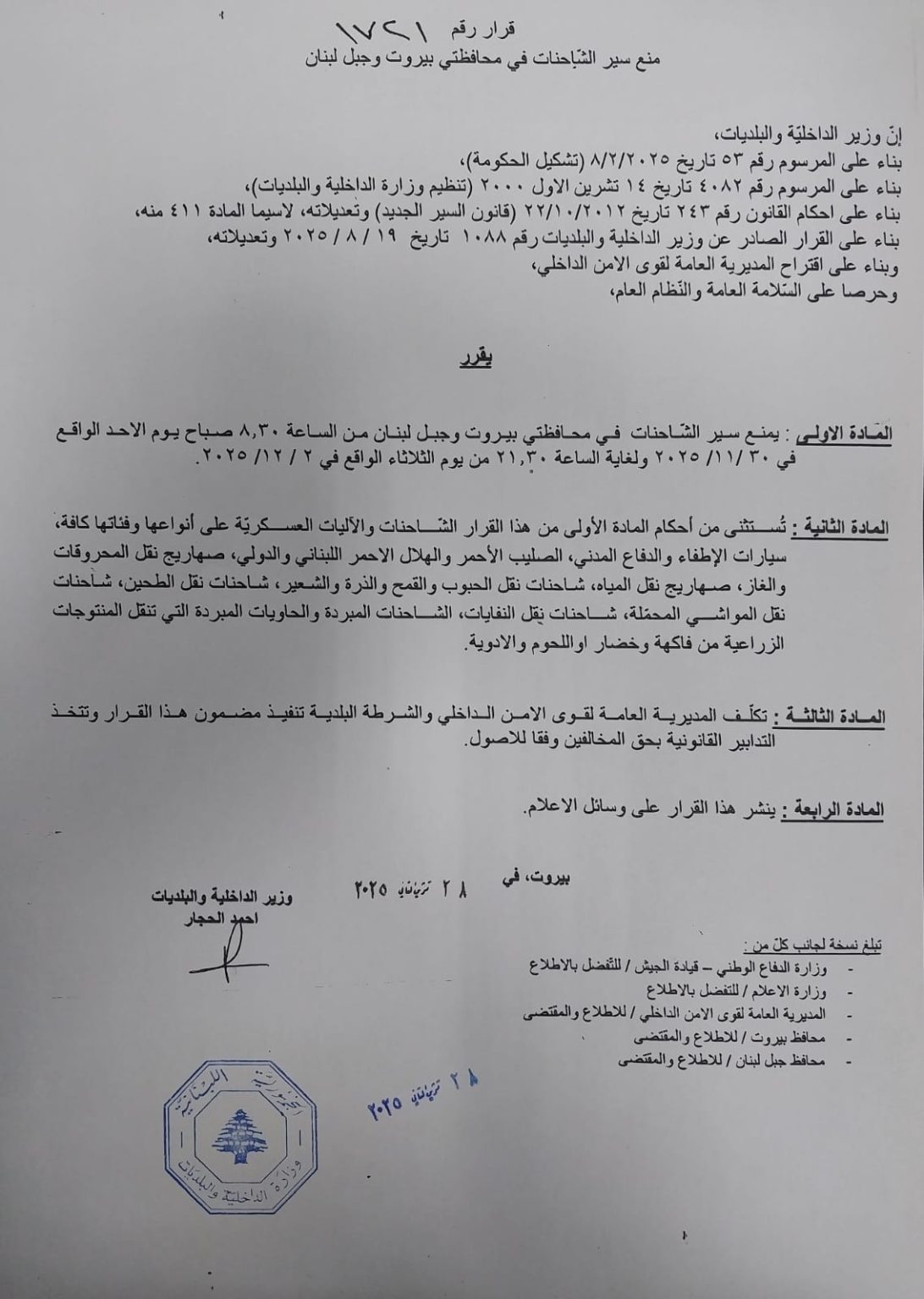 المادة الأولى: تقفل كافة المؤسسات السياحية والمحال التجارية التي تقع ضمن نطاق وسط بيروت (المنطقة الممتدة من نفق الرئيس سليمان فرنجية – جادة فؤاد شهاب وصولاً الى الصيفي) ابتداء من الساعة 12,00 فجر الثلاثاء 2/12/2025 ولغاية الساعة الثانية بعد الظهر من التاريخ نفسه.