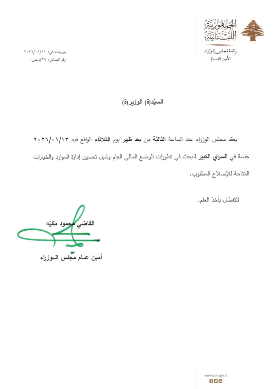 يعقد مجلس الوزراء، عند الساعة الثالثة من بعد ظهر يوم الثلاثاء الواقع في الثالث عشر من كانون الثاني الجاري، جلسة في السراي الكبير للبحث في تطورات الوضع المالي العام، وسبل تحسين إدارة الموارد والخيارات المتاحة للإصلاح المطلوب.
