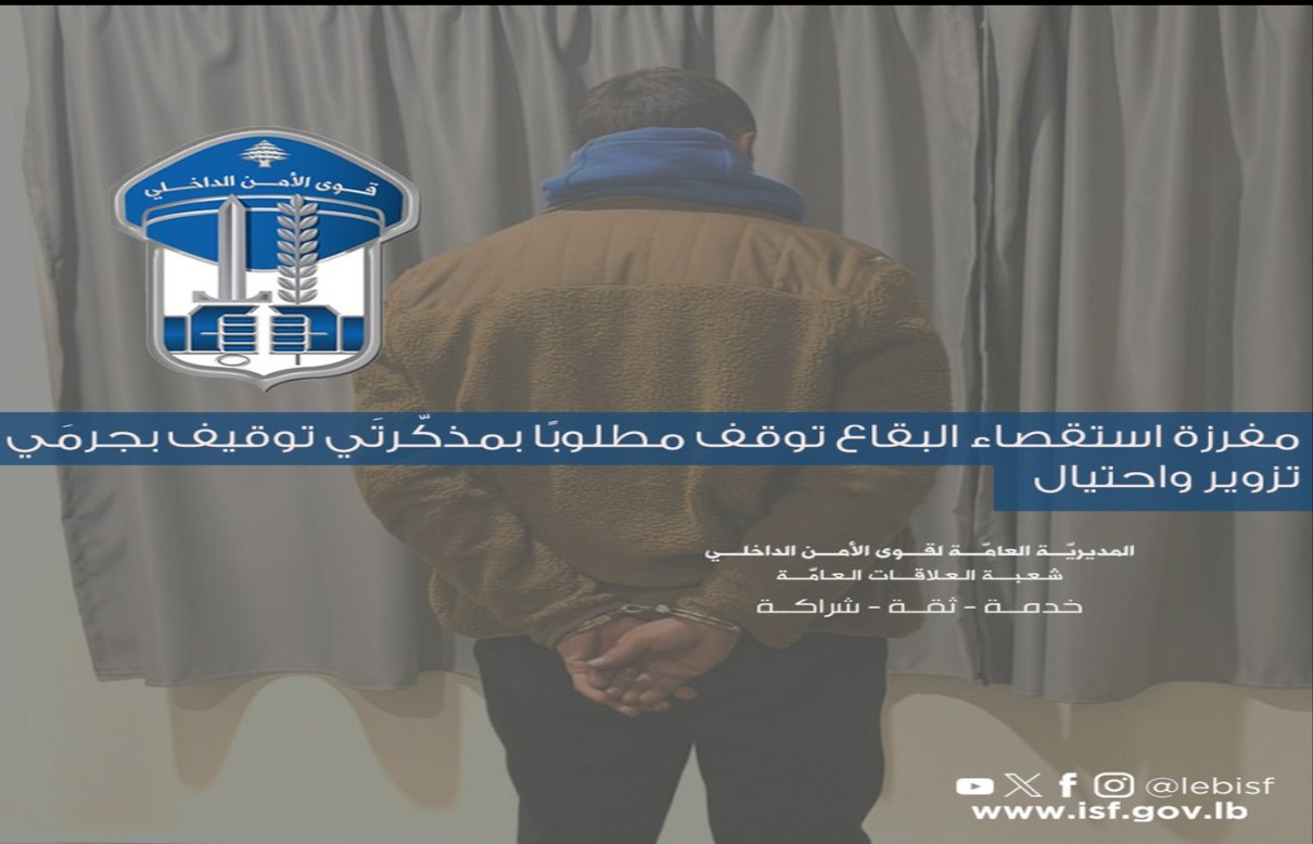 توقيف شخص على خلفية جرائم تزوير واحتيال في البقاع (صورة)