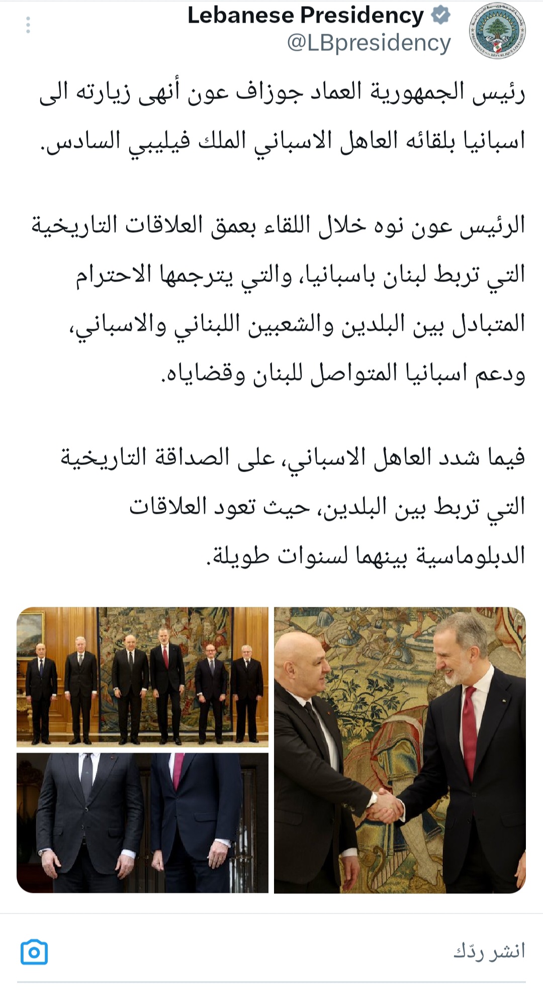 وخلال اللقاء، نوّه الرئيس عون بعمق العلاقات التاريخية التي تربط لبنان بإسبانيا، مؤكداً أنها تقوم على الاحترام المتبادل بين البلدين والشعبين اللبناني والإسباني، ومثمّناً الدعم المتواصل الذي تقدّمه إسبانيا للبنان وقضاياه.