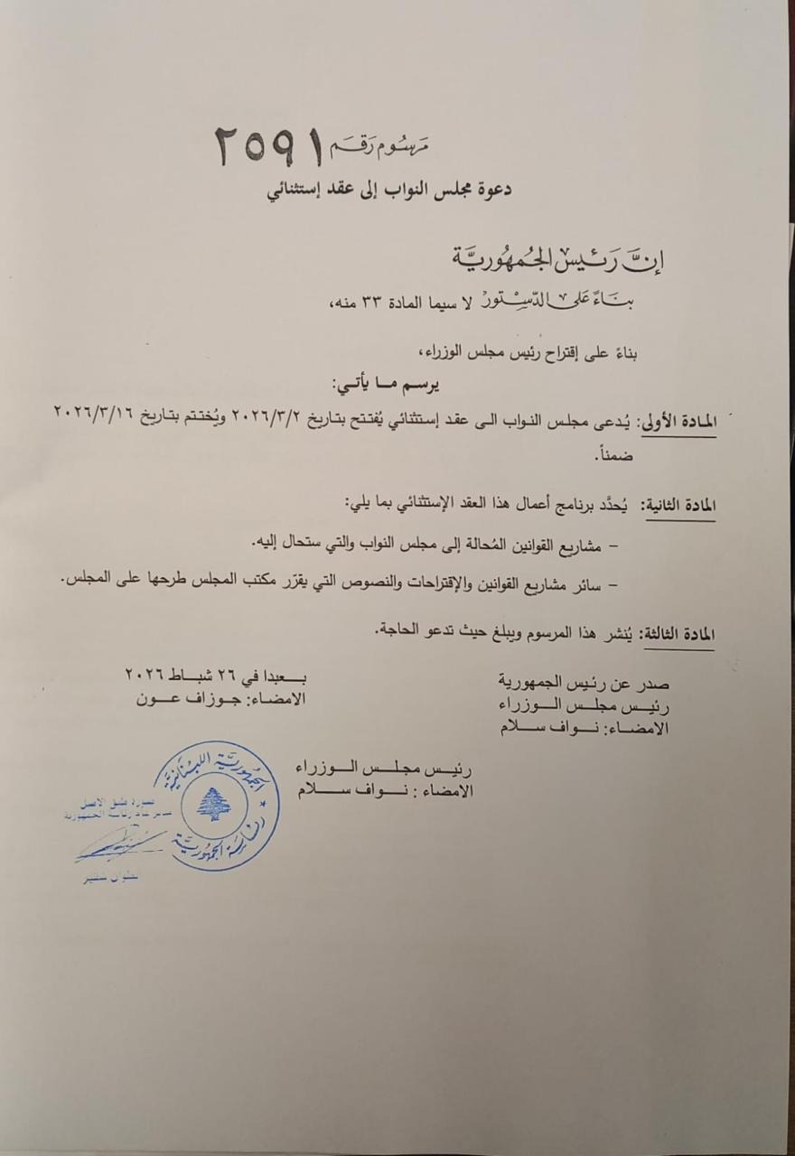 صدر ظهر اليوم المرسوم الرقم 2591 تاريخ 26 شباط 2026 القاضي بدعوة مجلس النواب الى عقد استثنائي يُفتتح في 2 آذار المقبل ويُختتم في 16 منه ضمنا. وحدد المرسوم، الذي وقعه رئيس الجهورية العماد جوزاف عون ورئيس مجلس الوزراء الدكتور نواف سلام، برنامج اعمال هذا العقد الاستثنائي لمشاريع القوانين المحالة الى مجلس النواب والتي ستحال اليه، وسائر مشاريع القوانين والاقتراحات والنصوص التي يقرر مكتب المجلس طرحها على المجلس.