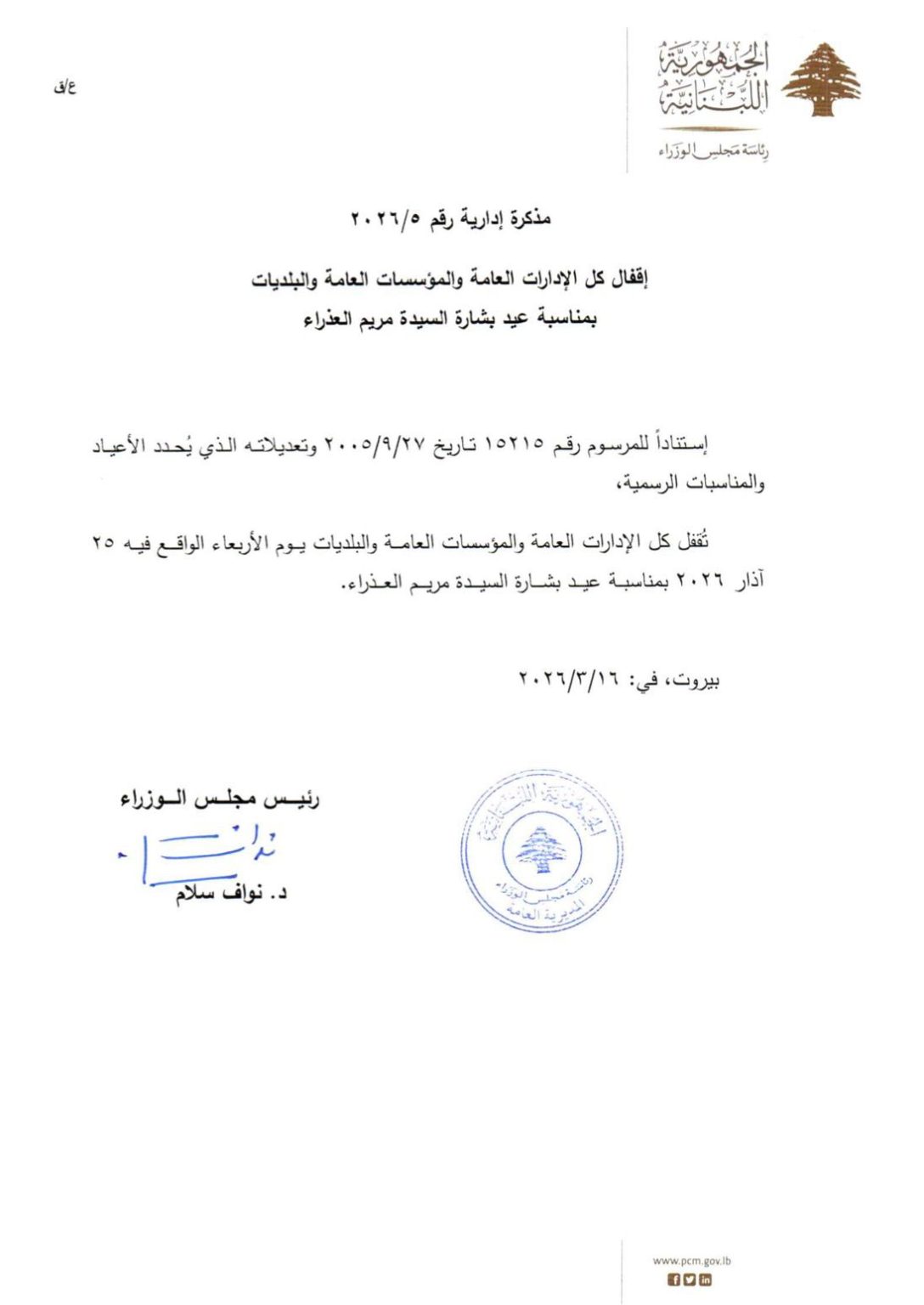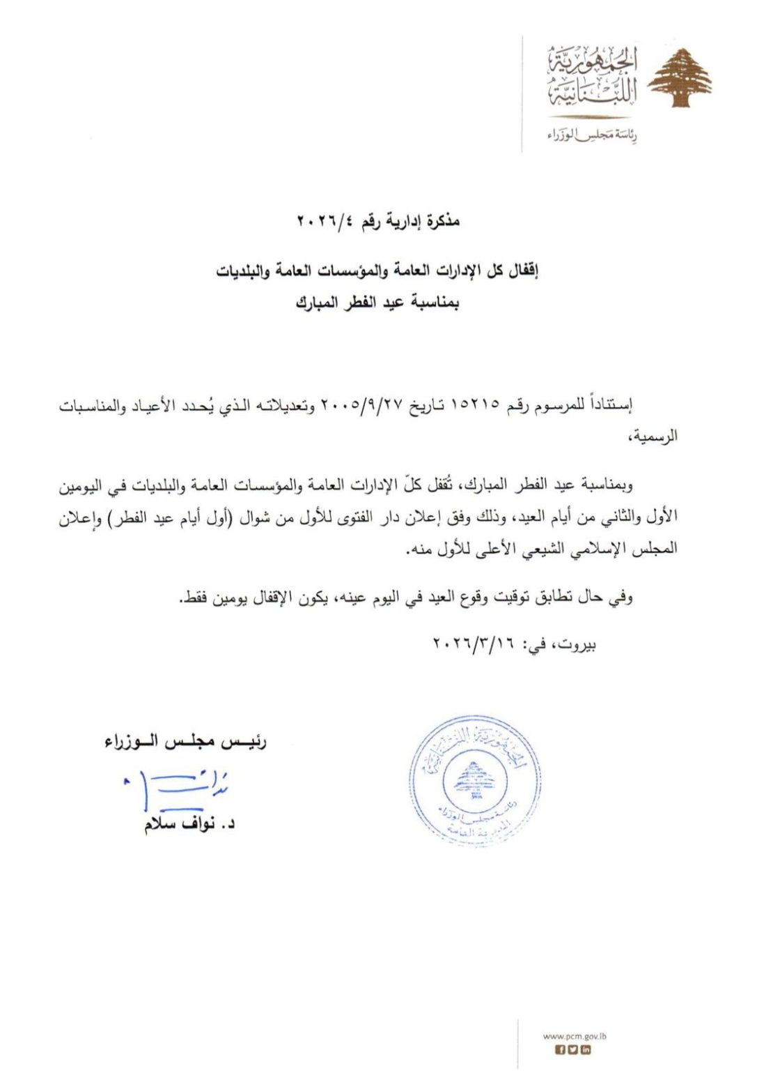 أصدرت رئاسة مجلس الوزراء في لبنان مذكرتين إداريتين تقضيان بإقفال جميع الإدارات العامة والمؤسسات العامة والبلديات لمناسبة عيد الفطر المبارك وعيد بشارة السيدة مريم العذراء.