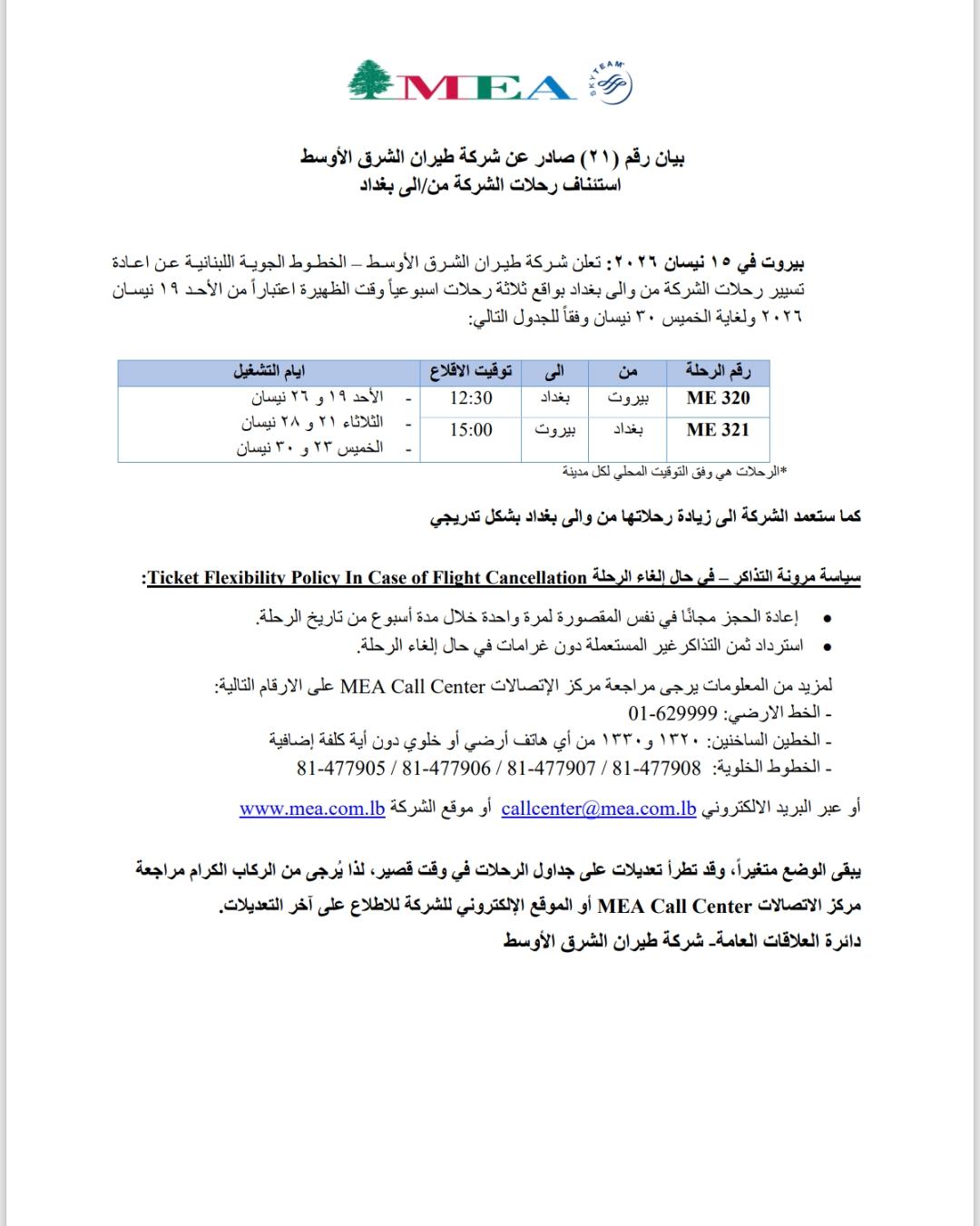 أعلنت شركة “طيران الشرق الأوسط – الخطوط الجوية اللبنانية” في بيان، “إعادة تسيير رحلاتها من بغداد وإليها، بواقع 3 رحلات أسبوعيًّا وقت الظهيرة اعتبارًا من الأحد المقبل ولغاية الخميس في 30 نيسان”.