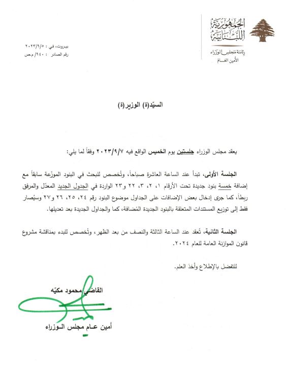يعقد مجلس الوزراء يوم الخميس المقبل في 7 أيلول الحالي جلستين في السرايا الحكومية.