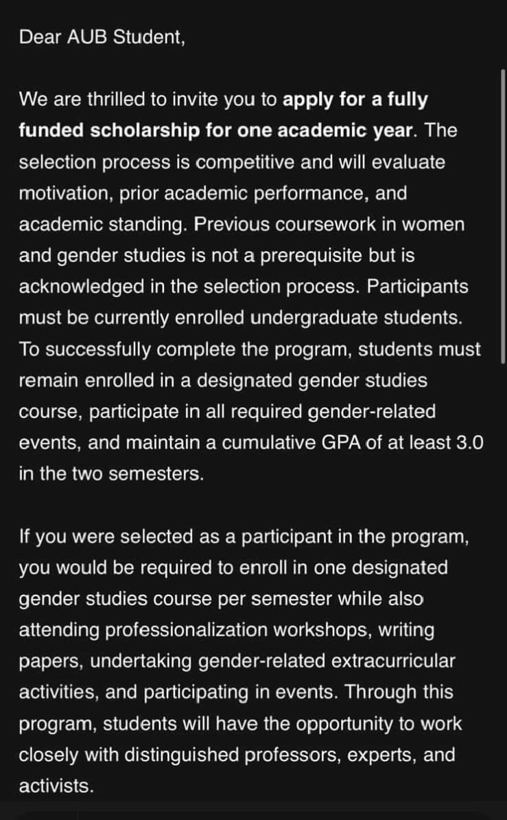 باتت المنح والمساعدة المالية للطالب بالجامعة الاميركية في بيروت حكرا على الشاذين جنسيا وحكرا على من يأخذ الصفوف في مادة gender studies التي تشجع الشذوذ الجنسي والتبدل الجنسي والانقلاب من رجل الى سيدة وبالعكس.