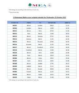 أعلنت شركة طيران الشرق الأوسط -الخطوط الجوية اللبنانية، عن جدول رحلاتها ليوم الأربعاء 25 تشرين الأول 2023.