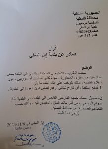 منع رئيس بلدية ابل السقي الجنوبية (قضاء مرجعيون) استقبال اي نازح لبناني أو غير لبناني قبل مراجعة البلدية، وهذا يعود إلى الأسباب الأمنية في المنطقة.