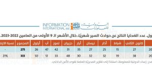 وفيما يلي جدول عدد الضحايا الناتج عن حوادث السير شهريًا، خلال الأشهر الـ 9 الأولى من العامين 2022- 2023.