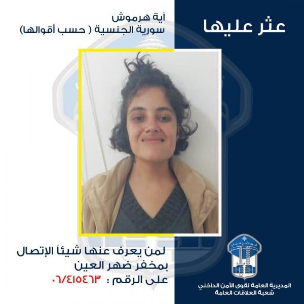 وطلبت المديرية من الذين يعرفون شيئًا عنها أو عن ذويها، إبلاغهم الحضور إلى مخفر ضهر العين في وحدة الدرك الإقليمي، أو الاتصال على الرقم: 415463-06 بغية استلامها.