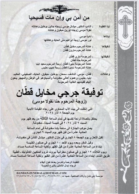 توفّيت السيدة توفيقة جرجي مخايل قطّان ارملة المرحوم حنا نقولا موسى، والدة عضو كتلة التنمية والتحرير النائب ميشال موسى.