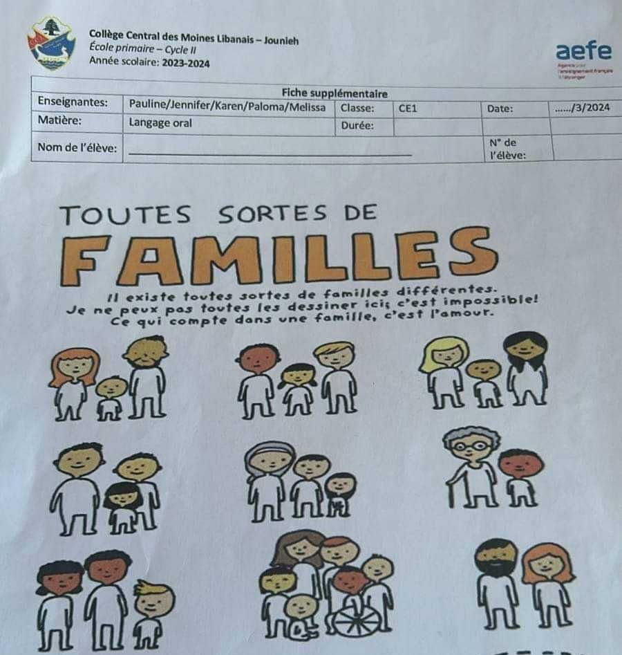 استدعت القاضي المنفرد في بعبدا جويل أبو حيدر، مديرة مدرسة المركزية في جونية والمعلمين المعنيين لجلسة استماع، بعد بلبلة أحدثتها ورقة تعليمية تتناول كيانَ العائلة ومكوناتِها.