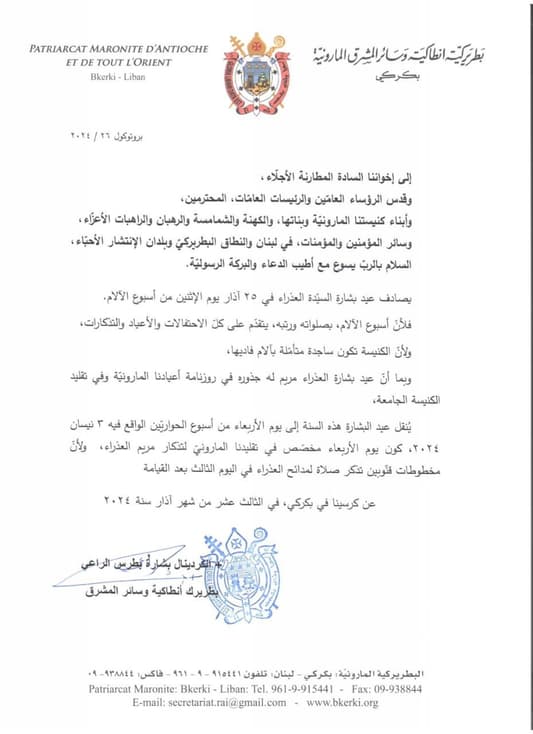 طلب البطريرك الماروني مار بشارة بطرس الراعي في مذكرة نقل عيد البشارة الى الأربعاء 3 نيسان.