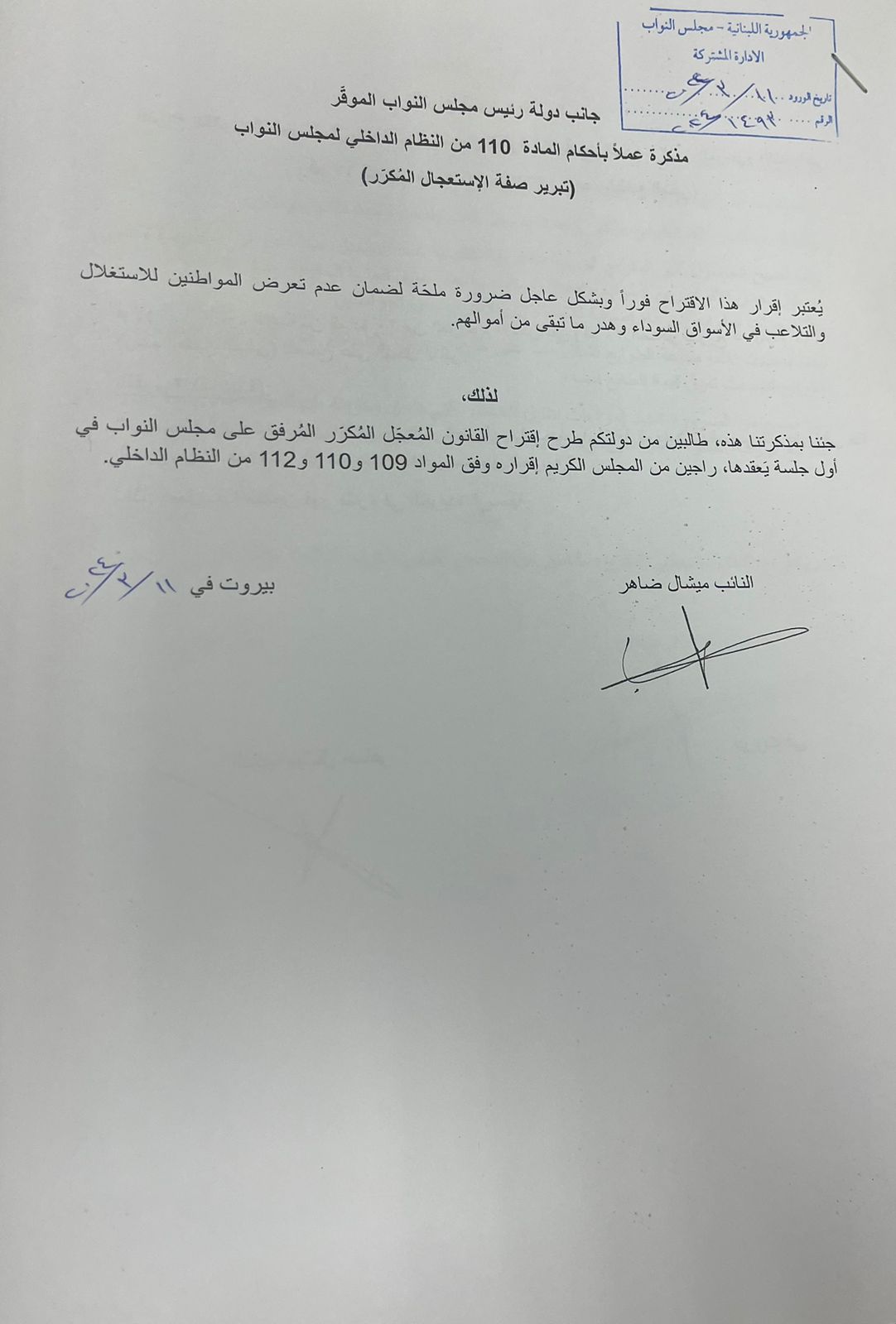 تقدم النائب ميشال ضاهر باقتراح قانون لتعديل المرسوم الاشتراعي رقم 67 الصادر في 05/08/ 1967 والمتعلق بالطوابع المالية.