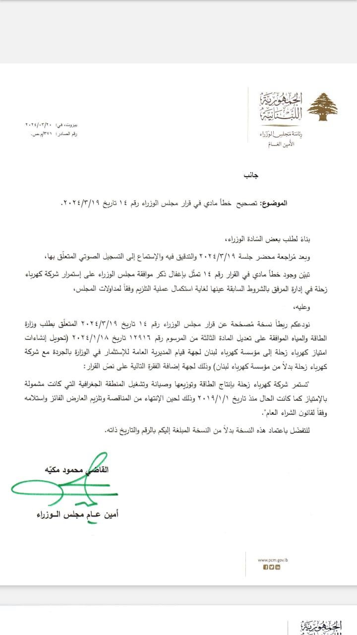بشأن “كهرباء زحلة”… مجلس الوزراء يصحح خطأ مادي بِقراره!