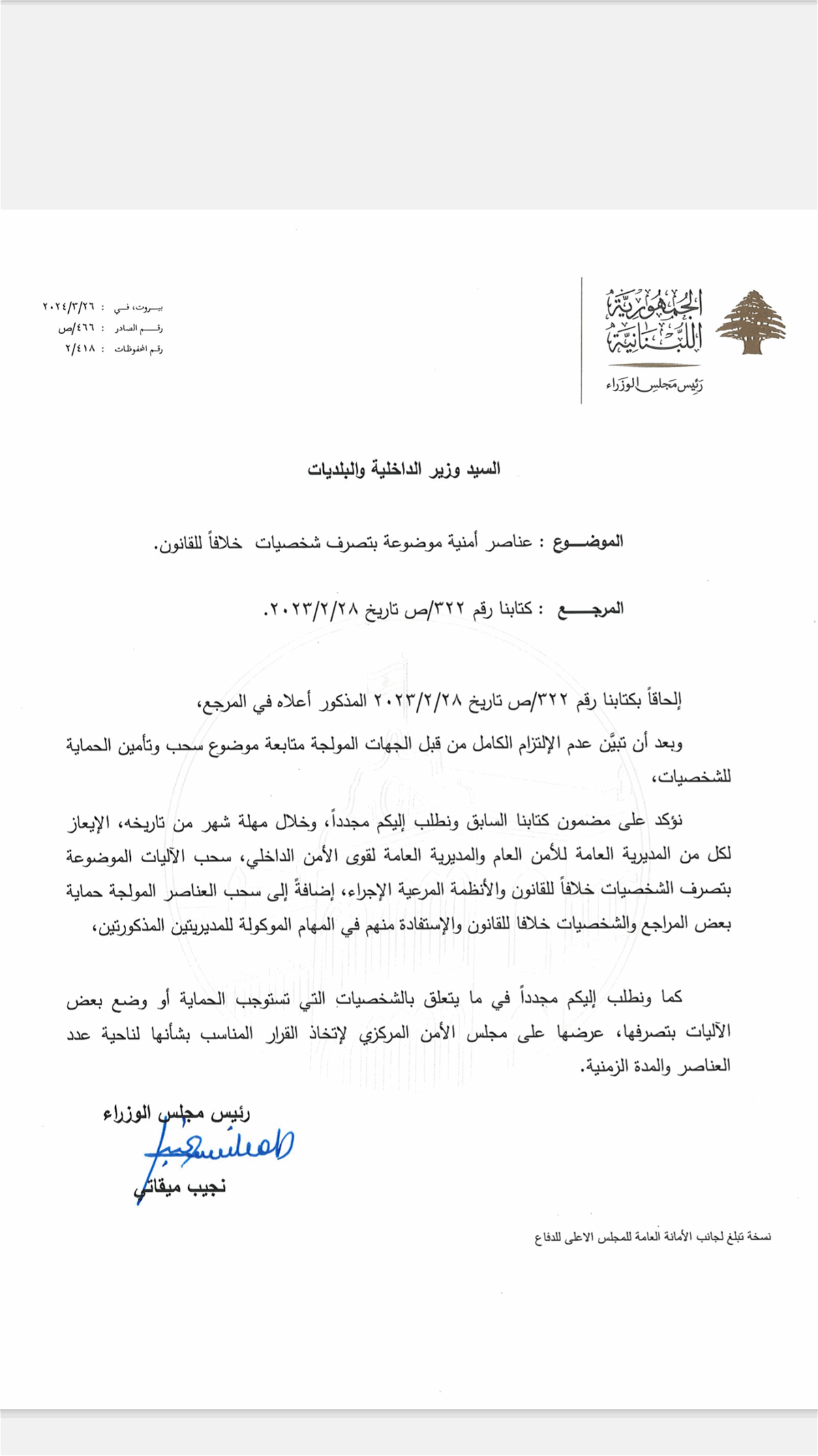 وجّه رئيس حكومة تصريف الأعمال نجيب ميقاتي كتاباً إلى وزير الداخليّة والبلديات بسام مولوي، حول العناصر الأمنية الموضوعة بتصرف الشخصيات.