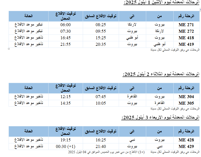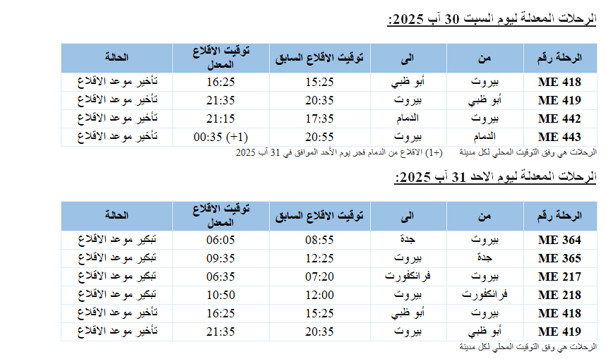 أعلنت شركة طيران الشرق الأوسط أنه ولأسباب تشغيلية، سيتم تعديل جدول مواعيد عدد من رحلاتها من وإلى كل من أبو ظبي، دبي، الدمام، جدة، لارنكا، القاهرة وفرانكفورت للفترة الممتدة من يوم السبت الموافق في 30 آب 2025 ولغاية يوم الاربعاء الموافق في 03 أيلول 2025.