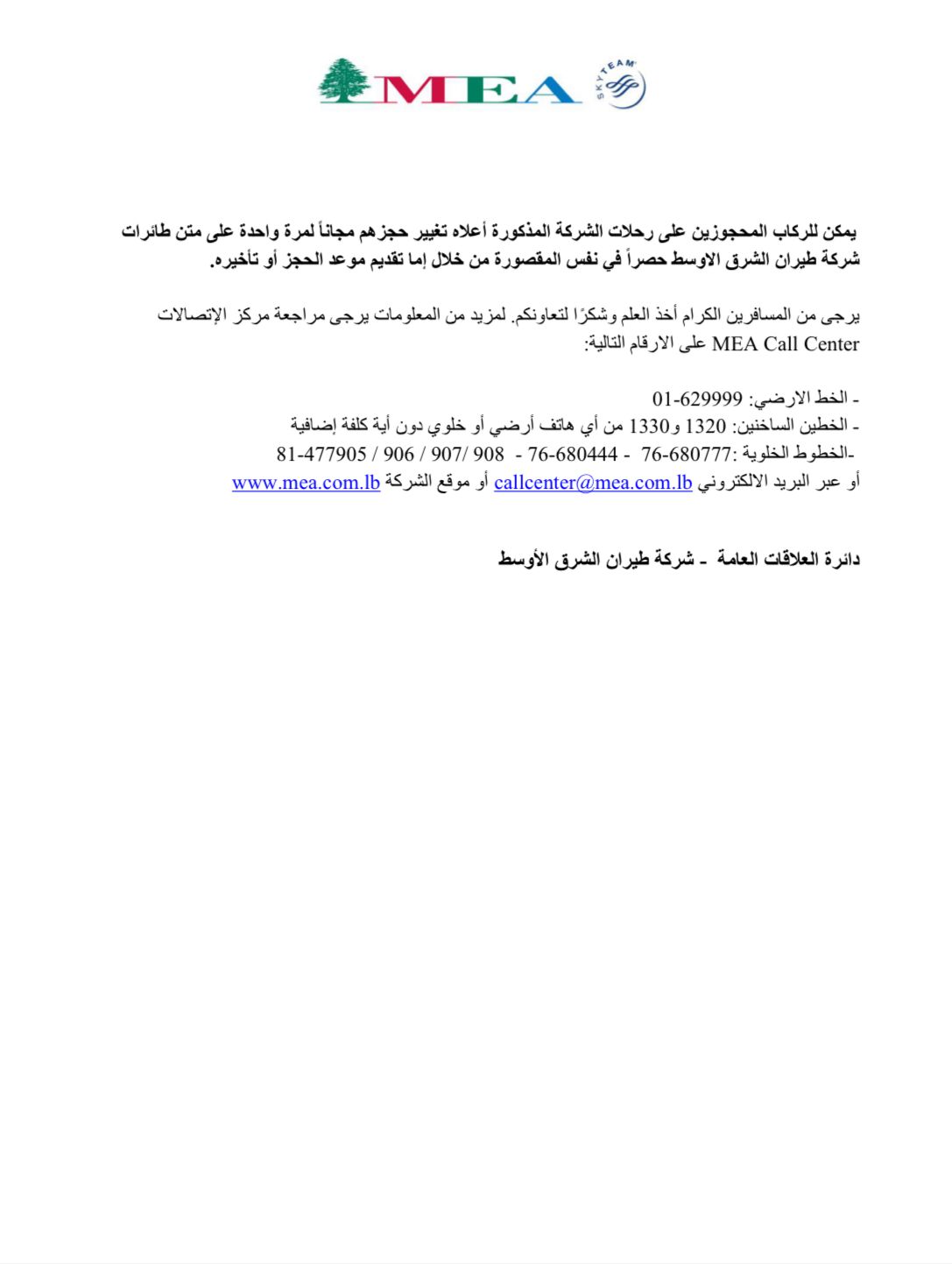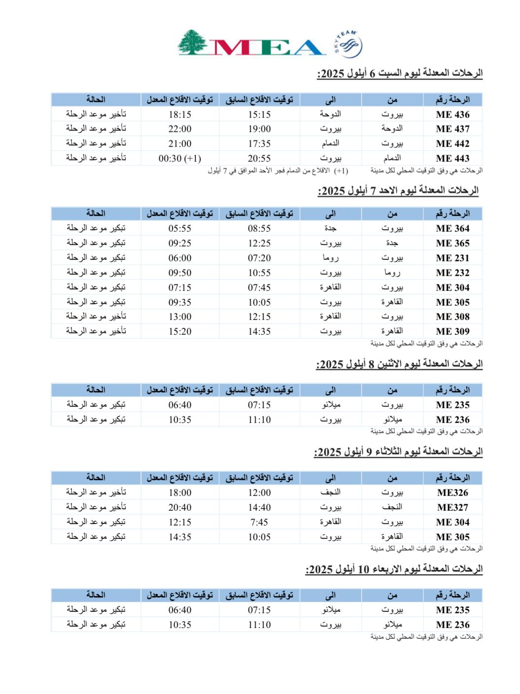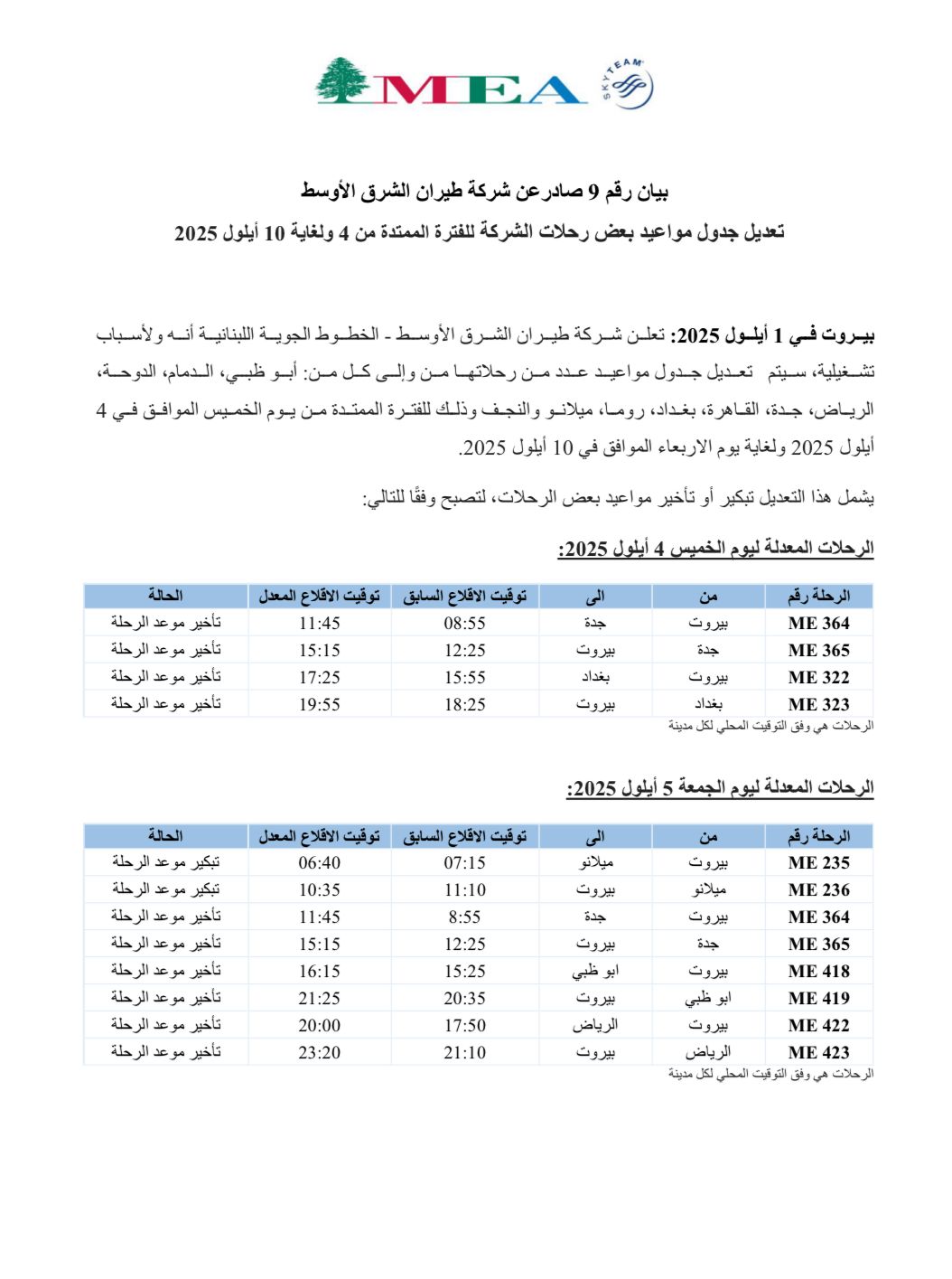 أعلنت شركة طيران الشرق الأوسط – الخطوط الجوية اللبنانية أنه ولأسباب تشغيلية، سيتم تعديل جدول مواعيد عدد من رحلاتها من وإلى كل من: أبو ظبي، الدمام، الدوحة، الرياض، جدة، القاهرة، بغداد، روما، ميلانو والنجف وذلك للفترة الممتدة من يوم الخميس الموافق في 4 أيلول 2025 ولغاية يوم الاربعاء الموافق في 10 أيلول 2025.