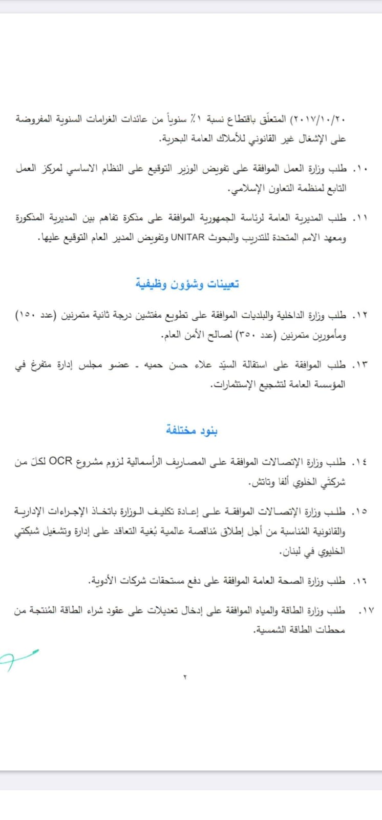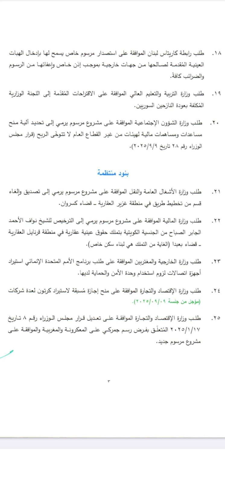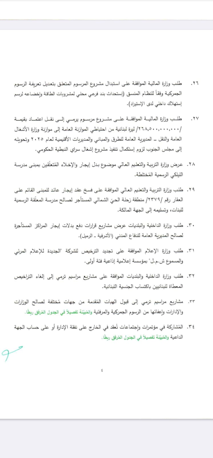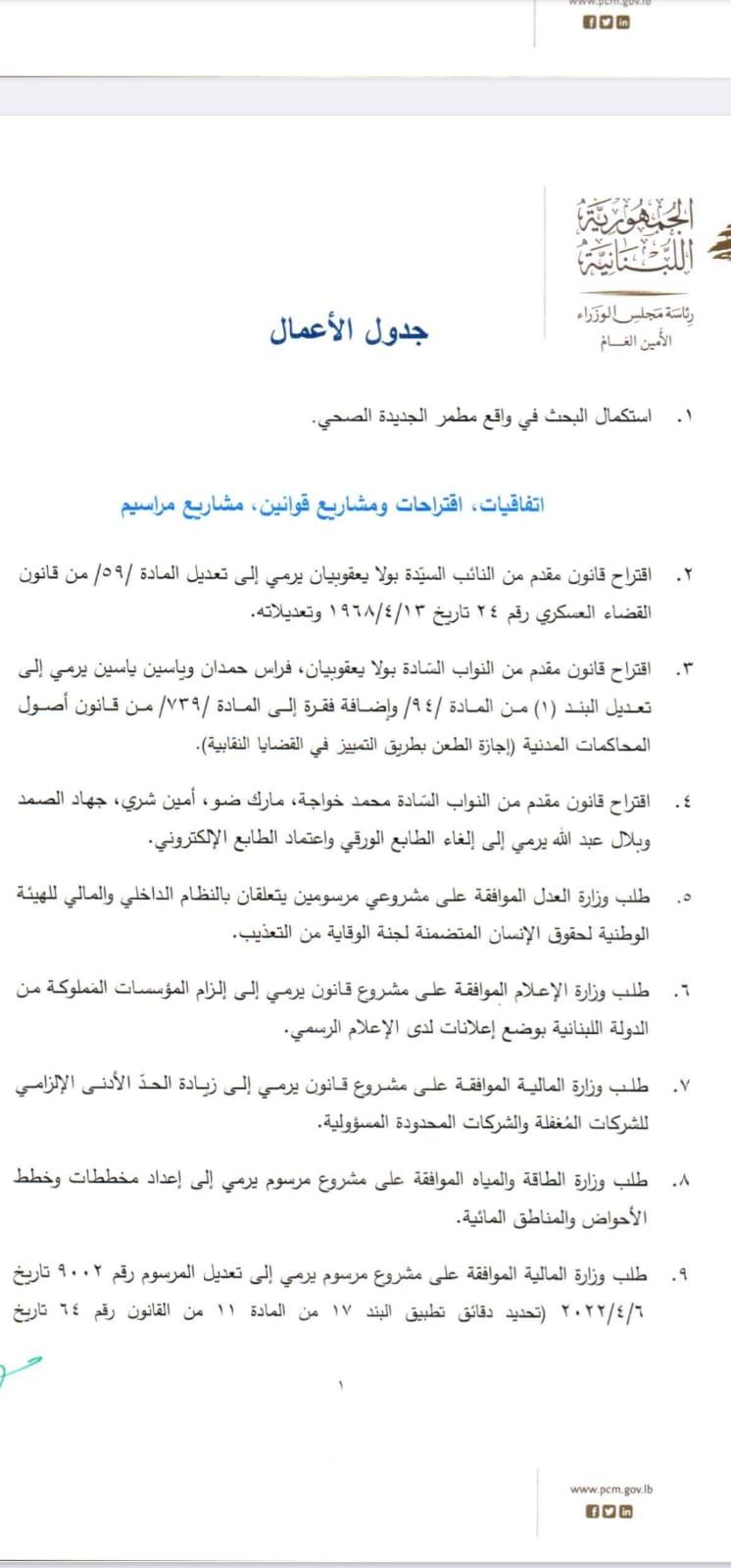 يعقد مجلس الوزراء جلسة عند الساعة الثالثة من بعد ظهر يوم الخميس 9-10-2025، في السراي الكبير.