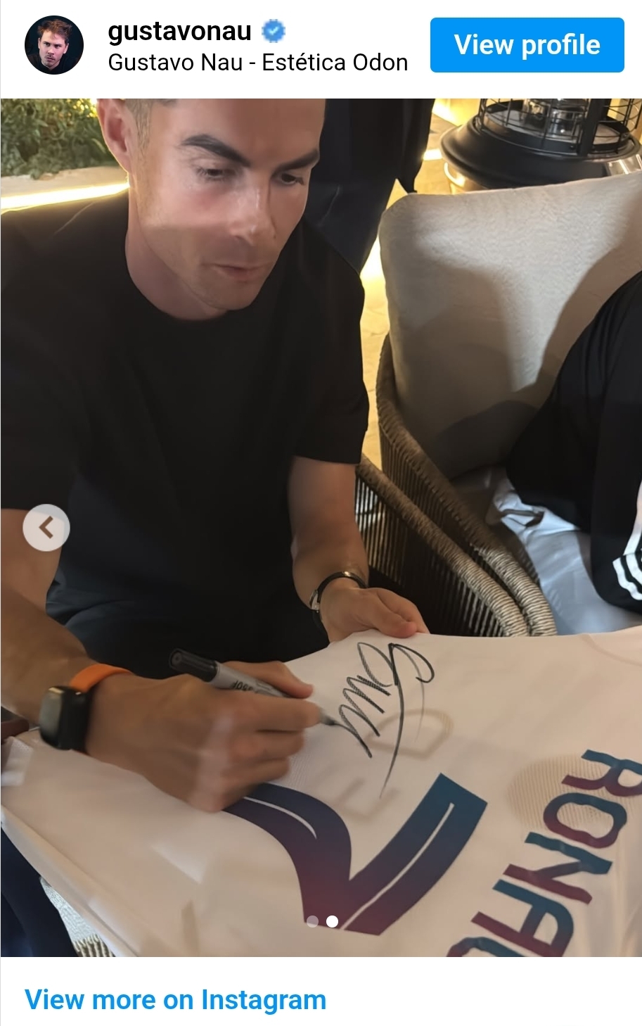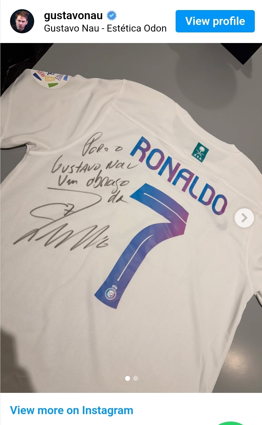 وحصل طبيب الأسنان غوستافو ناو، الذي يتولى علاج أفراد من عائلة رونالدو، على قميص يحمل توقيع النجم البرتغالي، وذلك كهدية من شقيقته كاتيا أفييرو ووالدته ماريا دولوريس.