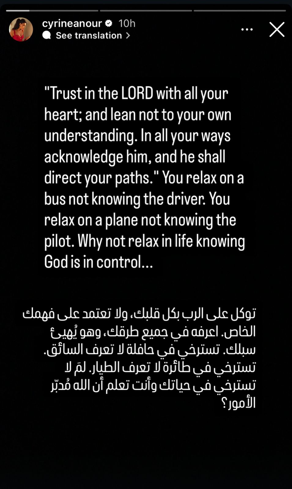 وقالت سيرين في منشورها: “توكل على الرب بكل قلبك، ولا تعتمد على فهمك الخاص. اعرفه في جميع طرقك، وهو يهيئُ سبلك.” مشبهةً حالة الاطمئنان في الحياة بحالة الاسترخاء في وسائل النقل التي لا تعرف قائدها مثل الحافلة أو الطائرة، متسائلة: “لمَ لا تسترخي في حياتك وأنت تعلم أن الله مُدبّر الأمور؟”