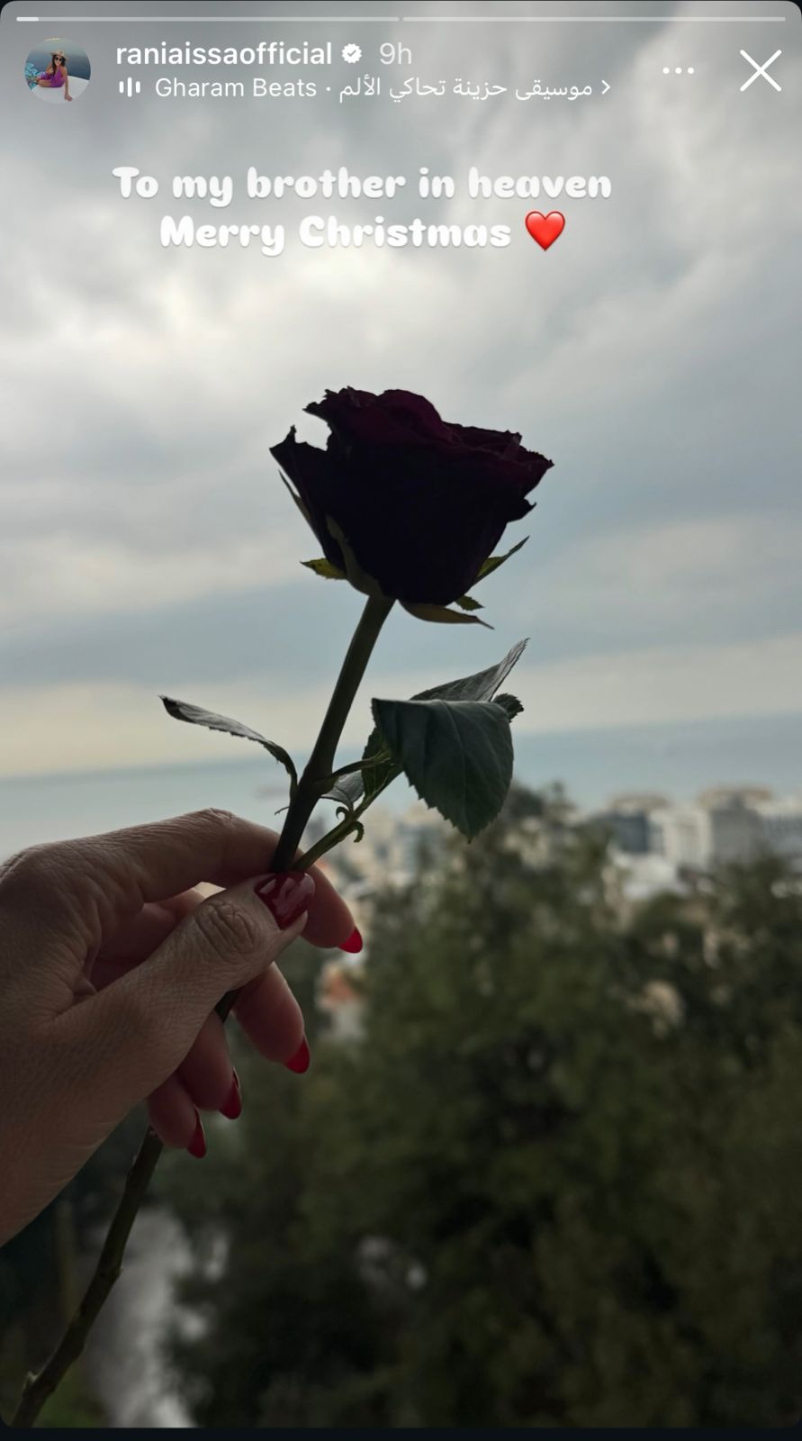 “To my brother in heaven, Merry Christmas” مع رمز قلب أحمر، مرفقة بصورة ليد تحمل وردة في خلفية غائمة، تعكس مشاعر الحزن والاشتياق.