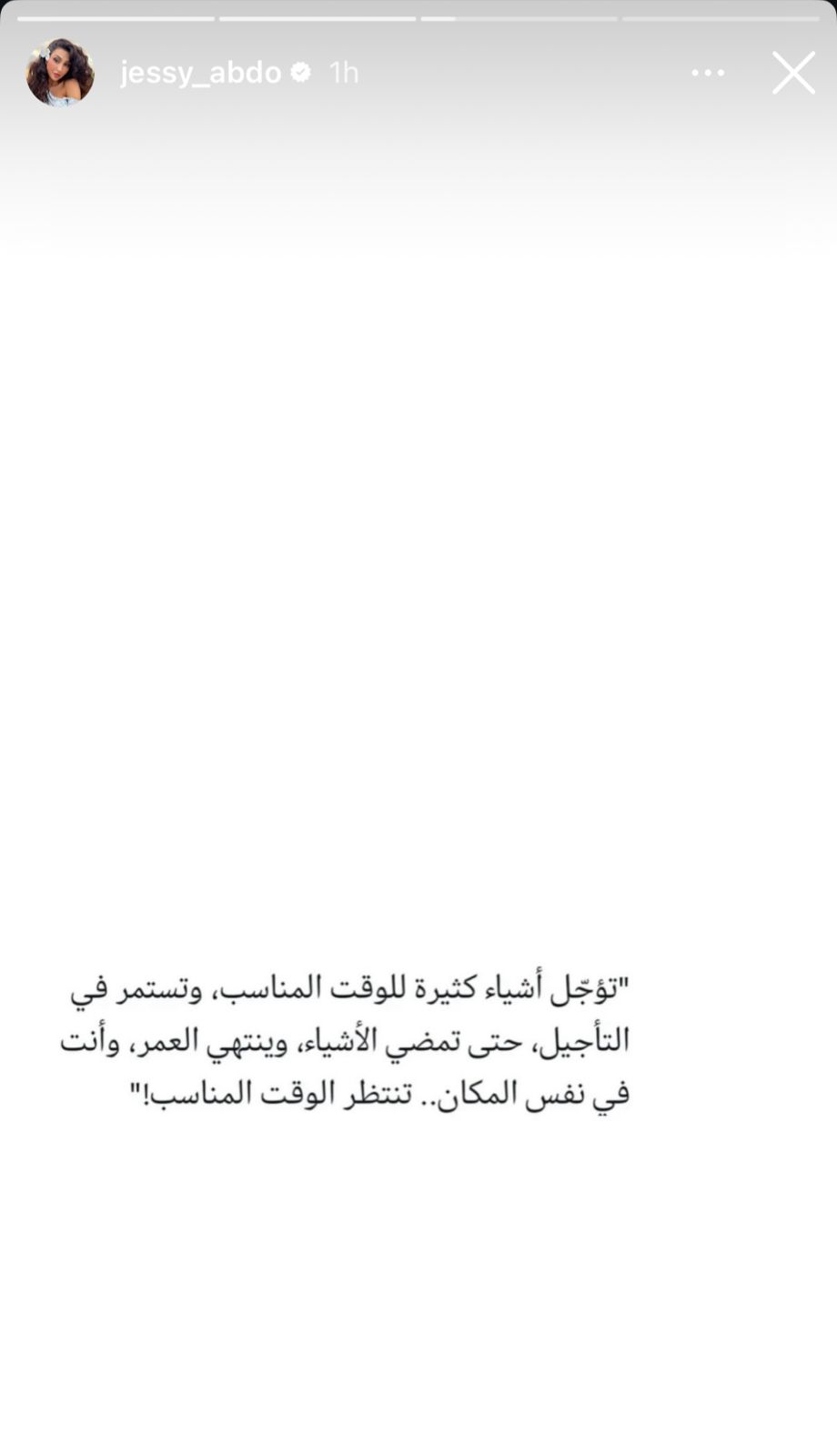 نشرت الممثلة جيسي عبدو عبر خاصية “الستوري” على حسابها في إنستغرام رسالة تأملية تحدثت فيها عن تأجيل بعض الأمور إلى “الوقت المناسب”، معتبرة أن بعض الأشياء تمضي مع مرور العمر بينما يبقى الإنسان في المكان نفسه بانتظار التوقيت الصحيح، ما أثار تفاعلًا وتساؤلات بين المتابعين حول دلالات الرسالة.