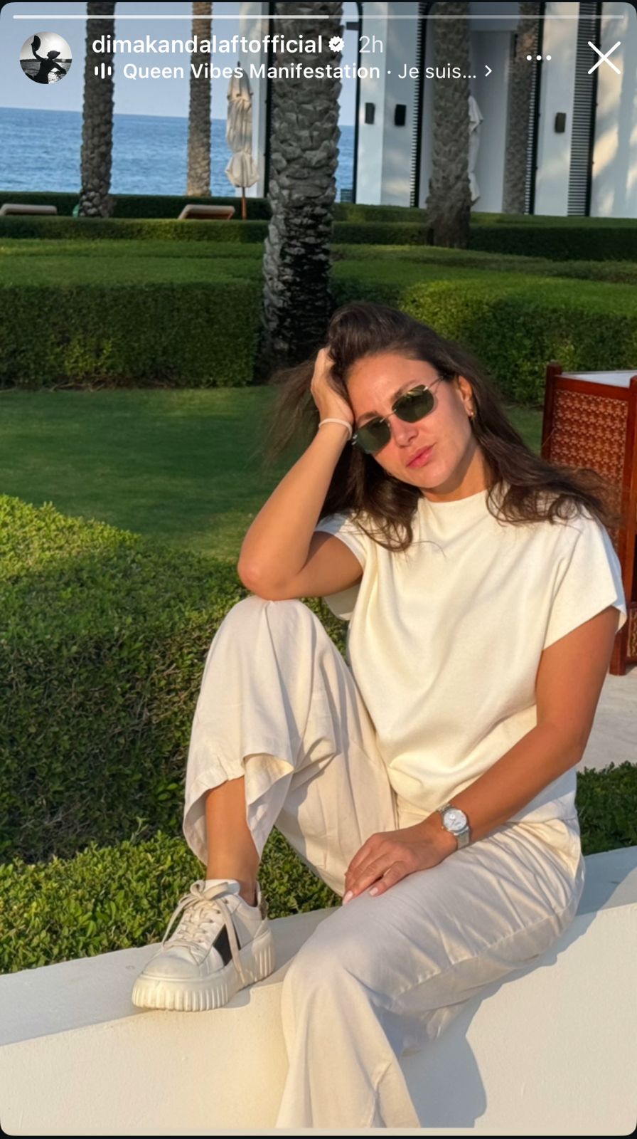 نشرت ديمة قندلفت صورة عفوية تظهر فيها بإطلالة مريحة وعصرية أثناء استجمامها في مكان مفتوح بجانب البحر، مرتدية ملابس بألوان محايدة ونظارات شمسية، وتعكس الصورة أجواء من الاسترخاء والهدوء بعيداً عن ضغوط الحياة.