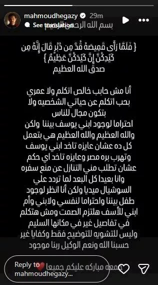وكتب حجازي عبر خاصية القصص القصيرة على حسابه بموقع التواصل الاجتماعي “انستجرام”: “أنا مش حابب خالص أتكلم ولا عمري بحب أتكلم عن حياتي الشخصية، ولا بتكون مجال للناس احتراما لوجود ابني يوسف بيننا، ولكن والله العظيم والله العظيم هي بتعمل كل ده عشان عايزة تاخد ابني يوسف وتهرب برة مصر، وعايزة تاخد أي حكم عشان تطلب مني التنازل عن منع سفره”.