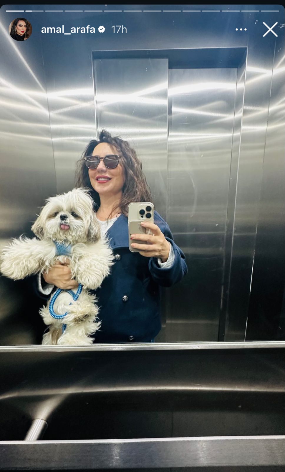 نشرت الممثلة أمل عرفة صورة شخصية من داخل مصعد، حيث ظهرت وهي تحمل كلبها الصغير بين ذراعيها بابتسامة عفوية ونظارات شمسية داكنة. الصورة تعكس جانبًا مرحًا وإنسانيًا من حياتها اليومية بعيدًا عن الأضواء، وشاركها جمهورها على حسابها الرسمي في وسائل التواصل الاجتماعي.