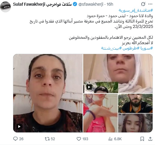 شاركت الممثلة السوريّة سلاف فواخرجي متابعيها على “إكس”، صوراً ومقاطع فيديو لسيّدة سوريّة تُناشد من يعرف مصير أولادها الثلاثة الذين فقدوا منذ حوالي شهرين.