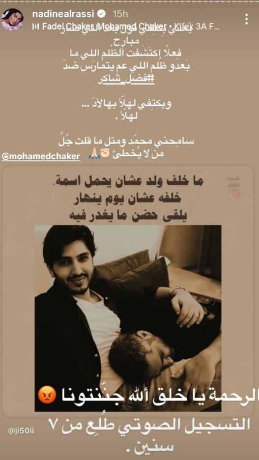 اعتذرت الممثلة نادين الراسي من الفنان فضل شاكر ونجله محمد وذلك بعد إساءتها لهما في منشور سابق عبر مواقع التواصل الاجتماعي، مؤكدة أنها تسرّعت في حكمها واعترفت بوقوعها في الخطأ.