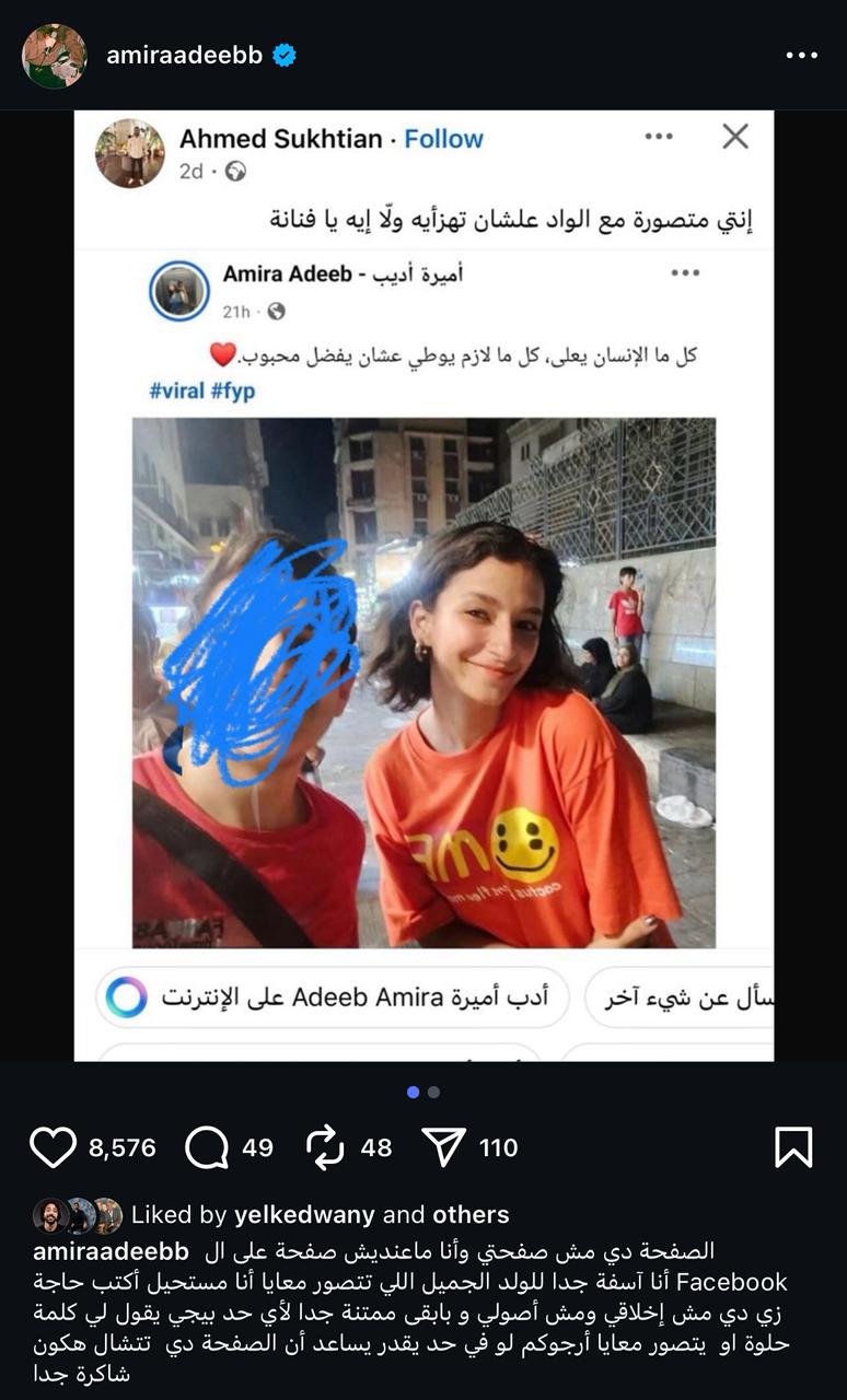 وجاء في المنشور المتداول أن حساب يحمل اسم أميرة أديب نشر صورة لها مع طفل وأرفقها بتعليق: “كل ما الإنسان يعلى، كل ما لازم يوطي عشان يفضل محبوب”.