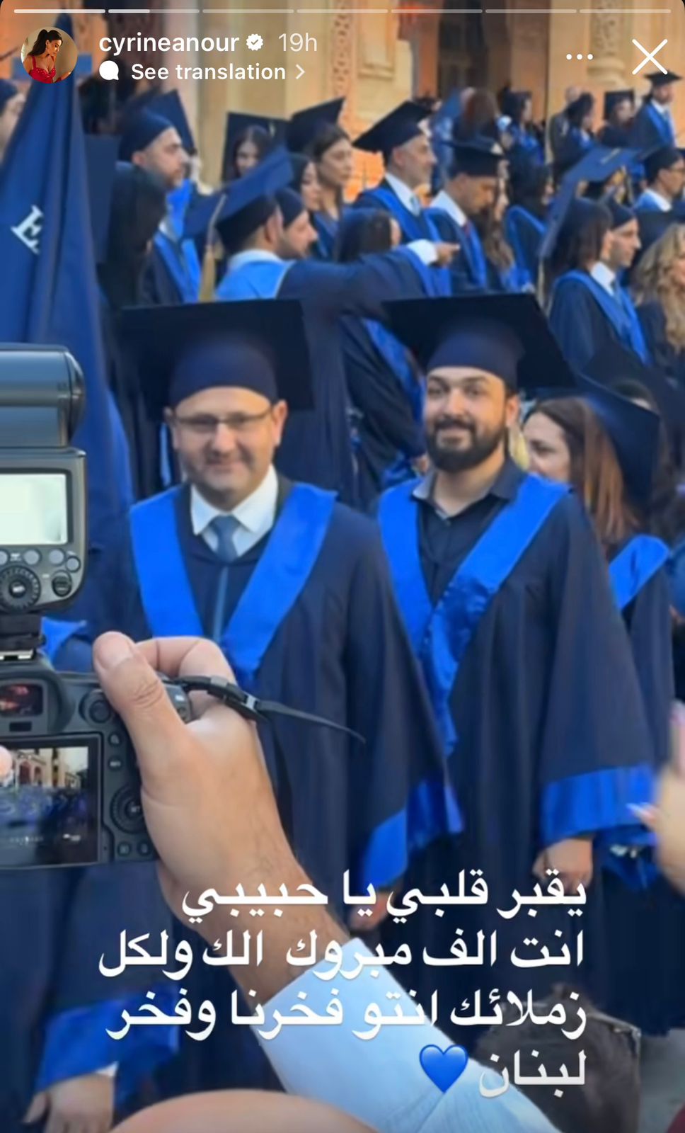 كما نشرت سابين بدورها لقطات مميزة لابنها خلال لحظة استلامه الشهادة، وسط أجواء مليئة بالفخر والفرح العائلي.