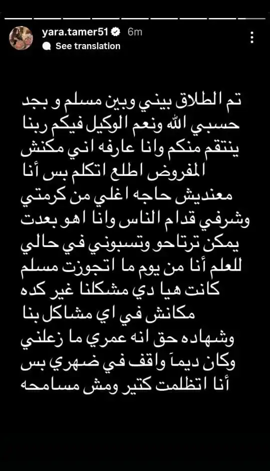 من جانبها، علقت يارا تامر على الانفصال عبر “ستوري” أيضًا، مؤكدة أن عائلة مسلم كانت السبب الأساسي في الانفصال، وكتبت: “تم الطلاق بيني وبين مسلم، وبجد حسبي الله ونعم الوكيل فيكم. ربنا ينتقم منكم. معنديش حاجة أغلى من كرامتي وشرفي قدام الناس”.