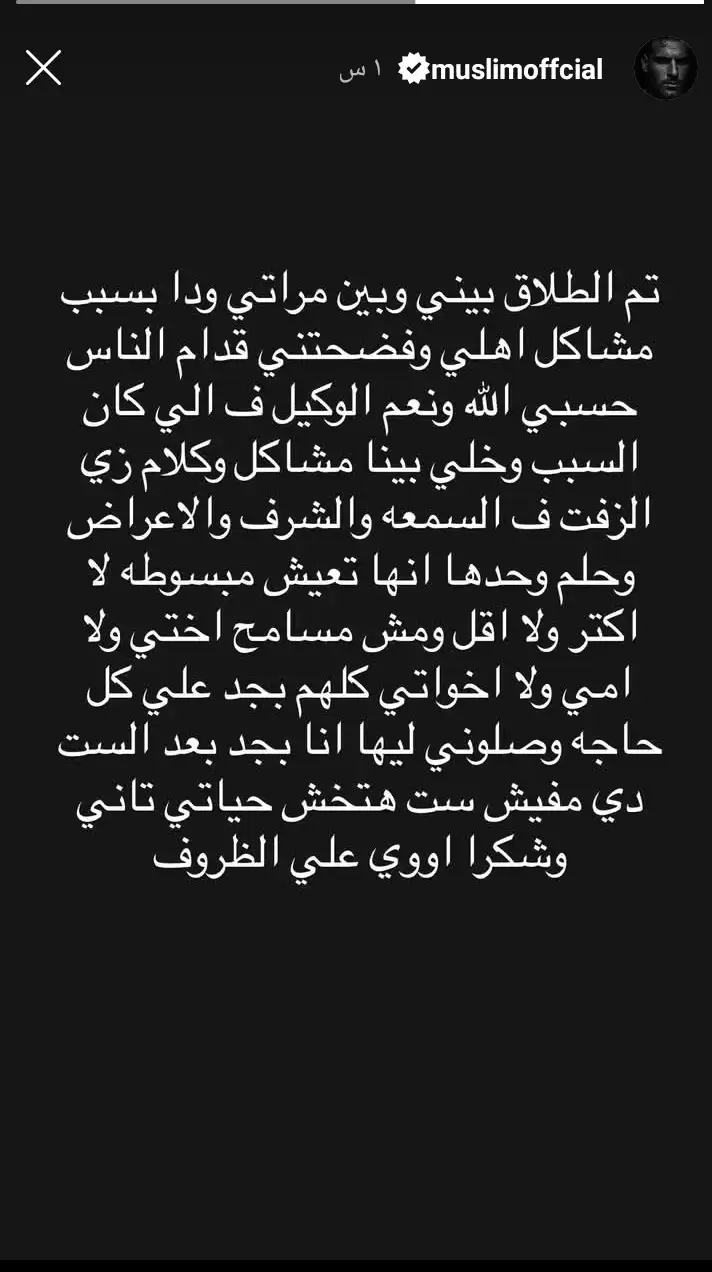 وفي رسالته، قال مسلم: “تم الطلاق بيني وبين مراتي بسبب مشاكل أهلي وفضيحتي قدام الناس. حسبي الله ونعم الوكيل في اللي كان السبب وخلى بينا مشاكل وكلام زي الزفت في السمعة والشرف والأعراض. حلمها الوحيد إنها تعيش مبسوطة، لا أكثر ولا أقل. مش مسامح أختي ولا أمي ولا إخواتي كلهم على كل حاجة وصلوني ليها. بعد الست دي مفيش ست هتخش حياتي تاني”، مضيفًا أنه “من يوم ما اتجوزت يارا كانت هي دي مشكلتنا الوحيدة، غير كده مكنش في أي مشاكل”.