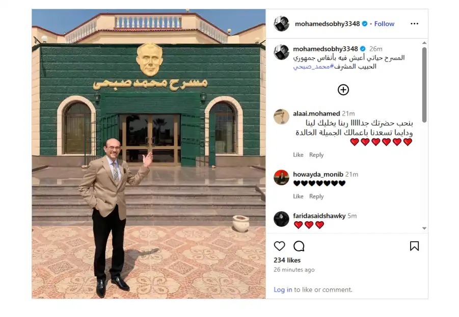 ونشر صبحي صورة عبر حساباته الرسمية، ظهر فيها واقفًا أمام المسرح، وعلّق قائلاً: “المسرح حياتي، أعيش فيه بأنفاس جمهوري الحبيب المُشرف”، في إشارة واضحة إلى عمق ارتباطه بفنه وجمهوره، وتحدّيه للظروف الصحية والطارئة التي مرّ بها أخيرًا.